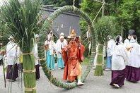 カヤで編んだ茅の輪くぐって登山者や家族の安全、健康をお祈り 南魚沼市の八海山尊神社で御山開き