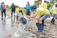 川でスイスイ、大きく育て! 新潟妙高市の斐太北小児童が矢代川でアユの稚魚を放流