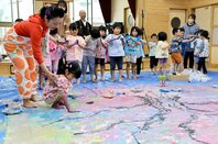 でっかい画用紙にいっぱいの彩り♪新潟上越市の明照幼稚園児が妙高の画家・野口佳代さんと創作コラボ 手のひらや足の裏で絵の具ペタペタ