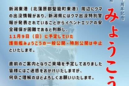自衛隊新潟地方協力本部は4日、新潟東港で11月9日に予定していた護衛艦「みょうこう」の一般公開・特別公開を中止すると発表した。会場付近にクマの出没情報があり、...