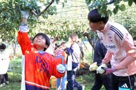 J1アルビ選手と一緒にル・レクチエ収穫 新潟市南区の小学生、地元の果樹園で