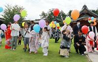新潟市中央区の護国神社で「七五三大祭」 健やかな成長願って風船空へ、晴れ着と笑顔で記念撮影