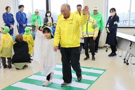春の全国交通安全運動(6〜15日)に合わせて、新潟西署は7日、保育園児に向けた交通安全教室を開いた。園児らは横断歩道を安全に渡るために「止まる、見る、待つ」を守ることや、手を上げて「渡るよサイン」を出すことの大切さを学んだ。