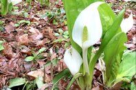湧き水流れる湿原、「天狗の谷」彩る純白の苞…新潟市西蒲区・角田山麓でミズバショウ見頃