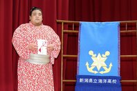 祝・新十両昇進!嘉陽に母校の海洋高校(新潟糸魚川市)同窓会が化粧まわし贈呈 金色に輝く校章、大相撲名古屋場所で披露へ