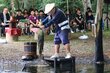 黒い原油が湧く池から、昔ながらの民具「カグマ」で採取! 歴史伝えようと胎内市で「黒川燃水祭」