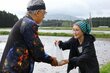 岩船コシおにぎり専門店「おにぎりぼんご」経営の右近さん(東京)、関川村の農家ねぎらう 握りたてを笑顔で手渡し