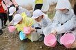 村上市の三面川で小学生が鮭の稚魚放流 約8000匹「戻ってきてね」