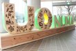 豪雪が育んだ新潟県魚沼市産木材、魅力をぎゅっとPR♪「UONUMA」のロゴをオブジェに 響きの森文化会館に展示