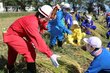 みんな!農業は楽しいんだ!のーりんジャー参上!トォー! 新潟県南魚沼市のおおまき小児童と稲刈り