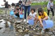 元気に泳いでる~!大きく育ってね!新潟魚沼市の佐梨川でイワナの稚魚放流 親子連れら40人参加、子どもたちが歓声