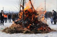 2025年の幸せ、燃え盛る炎に願う 新潟県柏崎市で復活2年目どんど焼き、あぶり立てのスルメや餅も