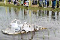水田の草刈り、ロボットにお任せ 津南町で有機農業に取り組む生産者らが水田用除草機の実演会