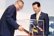 世界遺産「佐渡島の金山」と泳ぐ宝石「錦鯉」、観光連携これからも 佐渡市が小千谷市へ金塊レプリカ寄贈