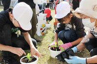 植物を育てて、思いやりの心育んで 長岡市寺泊・大河津小の全校児童、苗や球根を丁寧に植える