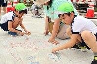 舗装前の橋を絵で埋め尽くせ♪ 長岡市で架け替えの宝田橋、みのり幼稚園園児がチョークでお絵描き