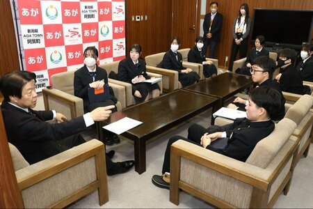 阿賀町の三川中学校3年生9人が、阿賀町役場に神田一秋町長を訪ね、町政への提言書を手渡した。人口減少や雇用創出に向けた対策などのアイデアが盛り込まれており、生徒たちは「町の未来に役立ってほしい」と願っている。