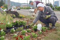 鮮やかな花々でおもてなし♪まちの玄関口に季節の彩り 新潟魚沼市の佐梨地区コミュニティ協議会、国道交差点脇の花壇に苗500鉢植え付け