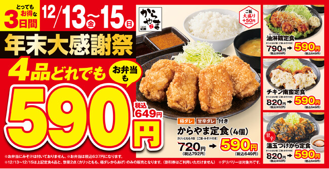 【お得で師走を乗り切る】人気の定食4品どれでも税込649円!からやま年末大感謝祭2024年12月13日(金)~15日(日)に開催