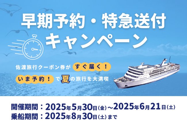 【佐渡汽船】夏の佐渡旅行や帰省に!佐渡旅行クーポン券『早期乗船予約・特急送付キャンペーン』