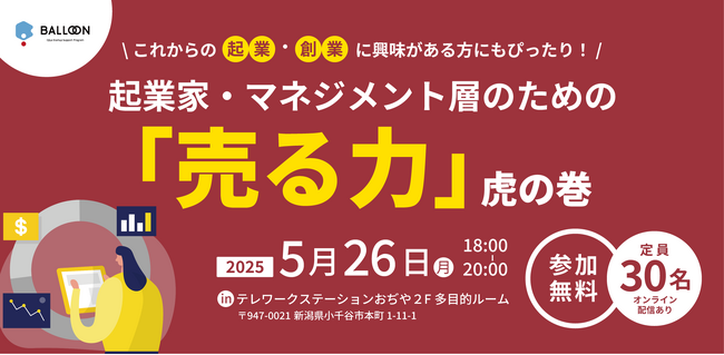 【新潟県小千谷市】5/26イベント「起業家・マネジメント層のための『売る力』虎の巻」を開催!(起業家育成支援事業「BALLOON」)