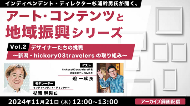 【自治体職員・クリエイター向け】デザインで地域を面白くする方法とは?好評セミナーから学ぼう!11/21(木)アーカイブ無料配信「杉浦幹男氏が聞く、アート・コンテンツと地域振興シリーズ vol.2」