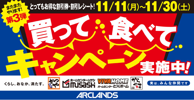 【第3弾も全国で】くらし、おなか、満たす。"買って 食べて キャンペーン"日本国内の「ホームセンタームサシ」「ビバホーム」「かつや」「からやま」で開催!