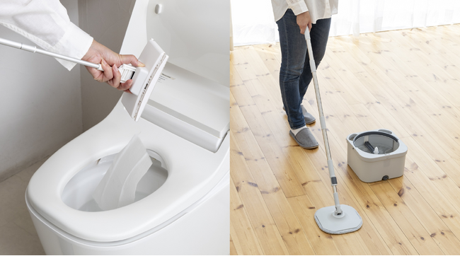 年末の床掃除に大活躍!コメリのオリジナルブランド「アテーナライフ」から「手を汚さない立つミニフローリングワイパー」と「きれいな水で洗える回転モップ」が登場