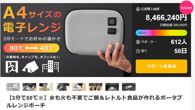 【防災の日に考える“あたたかい食事”】開始5日間で840万円突破!今注目の災害避難グッズ「ポータブルレンジポーチ」