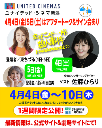 「ユナイテッド・シネマ新潟」にて4/4(木)~1週間上映『まぜこぜ一座殺人事件』 東ちづる×佐藤ひらり(全盲のシンガーソングライター)×水戸川真由美(アシスタントプロデューサー)による上映後トークあり