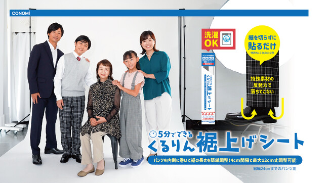 裾上げ革命!市販パンツに貼るだけ5分。長さ調節可能な裾上げパーツ 特許「くるりん裾上げシート」