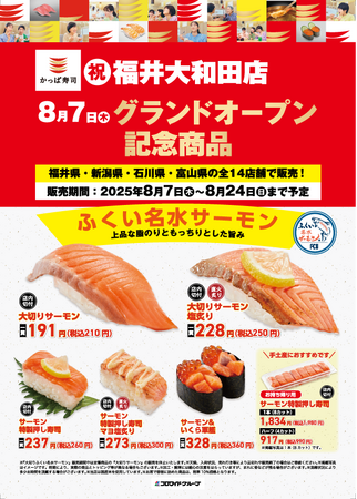 8月7日(木) 『かっぱ寿司 福井大和田店』グランドオープン記念! 福井県のサステナブルな名産品「ふくい名水サーモン」を使用した 特別記念商品が福井県含む北陸の全 14 店舗限定で新登場!