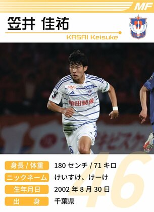 46 笠井 佳祐 KASAI Keisuke 更新:2024/12/8 18:12 背番号 46 ポジション MF(ミッドフィールダー) 出身 千葉県 身長/体重 180/71 経歴 中野木FC-VIVAIO船橋SC-関東第一高-桐蔭横浜大(特別指定) 選手個人記録(2024 J1リーグ戦) 出場試合数 0 出場時間(累計) 0 得点 0 関連記事はこちら 2024/5/22 [サッカー ルヴァンカップ・J1アルビレックス新潟]延長戦でMF石山青空が先制弾、MF奥村仁がダメ押しゴール!ブラウブリッツ秋田に2-0 1次ラウンド突破 同ポジションの選手(2024) 6 秋山 裕紀 8 宮本 英治 14 長谷川 元希 17 ダニーロ ゴメス 19 星 雄次 20 島田 譲 22 松田 詠太郎 25 藤原 奏哉 30 奥村 仁 33 高木 善朗 40 石山 青空 « 選手名鑑(2024シーズン) トップへ戻る