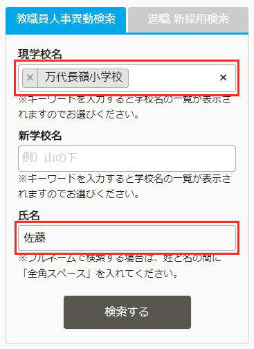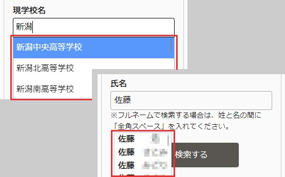 学校名や氏名の一部を入力すると、候補が表示されますので選択して検索することができます。