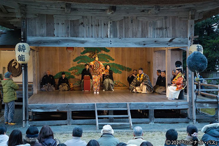 次第に夜が深まり、辺りは静寂に包まれた。かがり火に照らされた能舞台が闇夜に浮き上がる-。主人公の高宮利一(原田泰造)が家族旅行で薪能を鑑賞するシーンがある。撮影が行われたのは佐渡市の大膳神社能舞台だ。