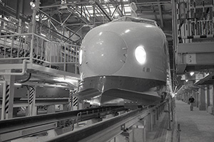 車体を台車に乗せる。先頭の「鼻」部分はまだ装着されていない。「早く走りたい」と、うずうずしているのだろうか。