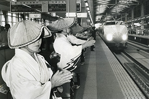 上越新幹線の開業日、新潟駅のホームでは「佐渡おけさ」が披露され、お祝いムードを盛り上げた(1982年11月)