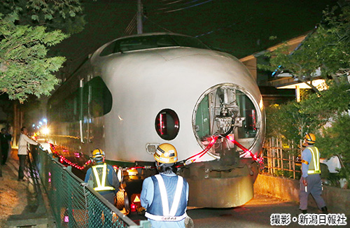新潟西港から新幹線車両基地に陸送される200系。早朝、約7.5キロをそろりそろりと1時間半かけて運ばれた。