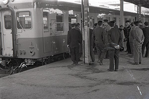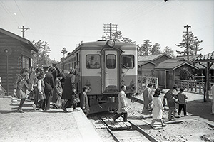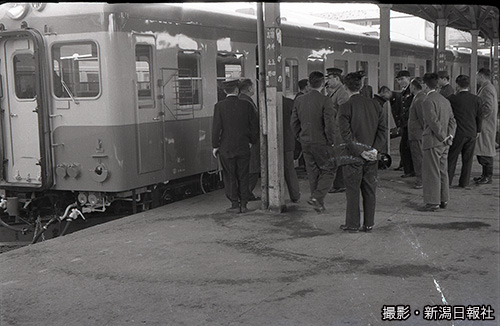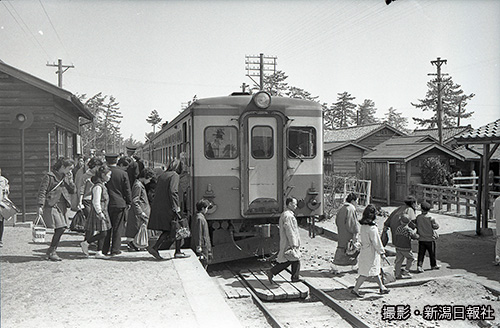 ベッドタウンとして急発展した新潟市の寺尾地区。寺尾駅はまだ構造が古く、列車を降りた客はホームの階段を下り、列車の前を通って改札口に向かった(1963年4月)