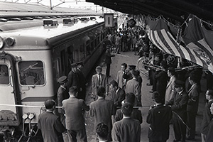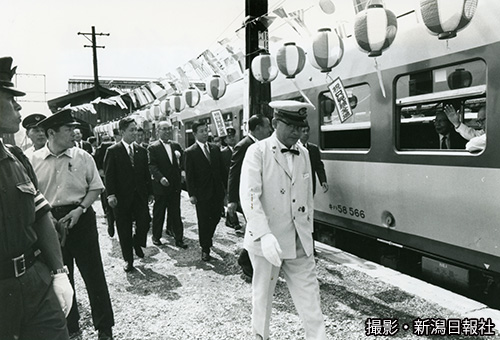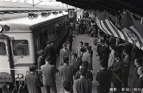 地震から半年。ようやく復旧の日を迎えた新潟駅で、準急「くびき」の出発式が行われた。万歳三唱する関係者に見送られ、列車が動きだす(1964年12月26日)