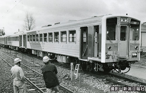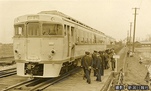 新潟鉄工が製作した新型の「キハ90」の試運転が白新線、羽越線で行われた。強力な300馬力のエンジンを搭載、時速は120キロという(1966年3月28日、当時の葛塚駅付近)