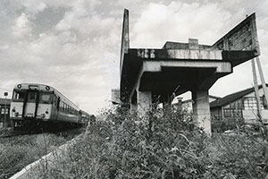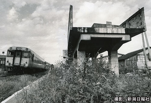 後に「ほくほく線」となる高架橋の横で撮影された気動車。新線の開業までには長い歳月を必要とした。写真は1983年、十日町市内で撮影されたもの。開業の14年前である