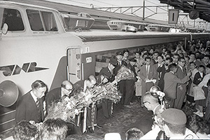 デビューをひと月後に控えた1962年5月10日、県内に姿を見せた特急「とき」の試運転列車。東海道線を走る「こだま」と同じ外観ながら、上越国境の山岳地帯を通過するために、「こだま」にはない強力な駆動装置とブレーキを備えた「161系」が導入された。ボンネット鼻先の赤いラインも「こだま」にはないもので、吹雪の中でも容易に識別できるように引かれた「警戒マーク」という。荻川-亀田間の直線コースでは時速95キロで快走。越後平野を駆け抜けるクリーム色と赤色のツートンカラーが鮮烈である。沿線にはカメラを構える人の姿も見える。