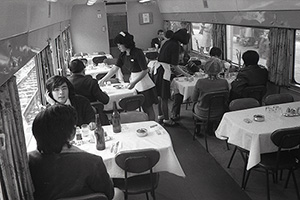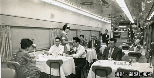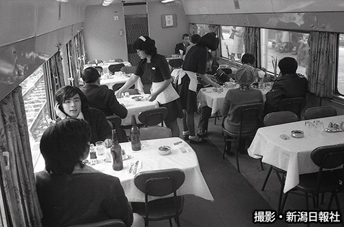 特急「とき」は当初、1編成のみだった。東京日帰りを可能にするため、新潟発は午前8時半に設定された。おなかがすくのは上越国境を越えたあたりである。食堂車の利用者は、水上-高崎間が多かったという。当時の本紙によると、メニューの中で一番高いものが750円。定食は200円以下だった。料理の提供は「大日本食堂」(当時)。平均的な客単価は、500円ほどの食事にビールを飲んで合計1000円前後だった。食堂車の給仕にチップを渡す客がいた時代で、「とき」デビューに際しては、「列車給仕がノーチップを決議した」と記事にある。