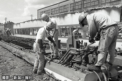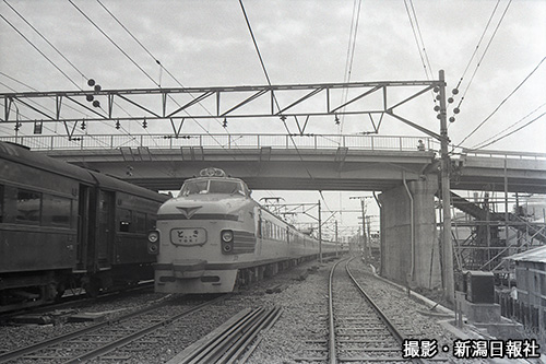 新潟地震から1年を経た1965年6月15日付け新潟日報の特集紙面に掲載された特急「とき」。新潟駅東跨線橋付近を走っている。当時の紙面を見ると、震災によって新潟駅、白山駅をはじめ国鉄の施設は大規模に損壊したが、復旧は旧ピッチで進められた。特に新潟支社の中枢である新潟駅は、1番線から7番線までの4本のホームが、地震発生の年の12月までに復旧したと書かれている。「とき」とすれ違う客車が時代を物語る。