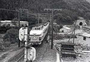 「日本国有鉄道百年史」によると、上越線は日本海側と太平洋側を結ぶ重要な路線であったが、1931年の開通以来、全線が単線だったため、輸送量は限界に達していた。戦後、上越国境を挟んで群馬県側でも、新潟県側でも順次複線化が進められてきたが、最後に残ったのが水上-土樽間だった。下り専用の新清水トンネルが着工されたのは63年9月。4年の歳月を経て、67年9月28日に開通した。複線化の完了である。写真は開通直前のもの。ときが走行している側が清水トンネル、右奥が新清水トンネルと推定される。複線化によって、ときは大幅にスピードアップ。デビュー時に新潟-上野間4時間40分かかっていたものが、複線化によって3時間55分となった。ほかの急行も、5分から25分早くなった。