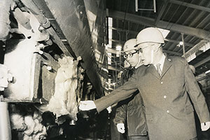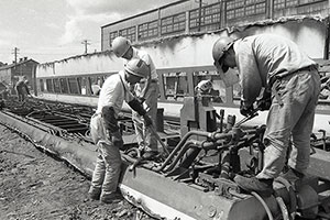 新津市(当時)の国鉄新潟車両管理所から大山工場に入ってきた車両は、バーナーで焼き切られる。解体された後の素材は、製鉄メーカーなどに搬出される。 -