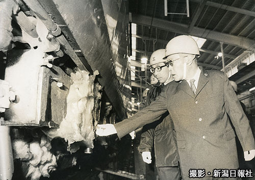 1963年は昭和38年。いわゆる「38(さんぱち)豪雪」の年である。1月24日から運休していた特急「とき」が運転を再開したのは2月18日。新潟発午前8時30分。本紙夕刊は、この時の様子を次のように伝えている。「乗客は160人。車券の発売が3日間しかなかったので、いつもよりちょっと少ない。それでも乗る人、送る人、見守る駅員みんな『アア、これでよかった』といったはればれした表情。運休の間を他の作業をやらされていた運転士も『ええ、やっぱりこの方がいいですね』と車体をなでる」。写真は長岡市宮内付近