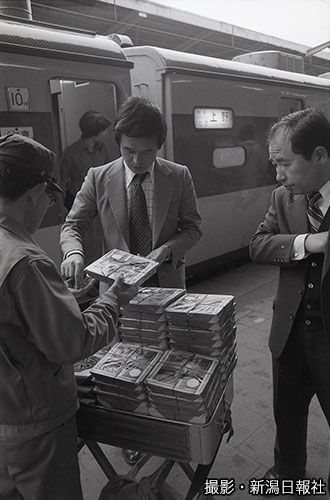 1978年春、新潟駅のホームで撮影されたワンショット。駅弁を満載したワゴンの背後に見えるのは特急「とき」。行き先表示は「上野」である。当時の記事を読むと、「駅弁業界は、窓の開かない特急列車が増えるたびに打撃を受けた」とある。「とき」の乗客に弁当を売る場所は、写真のように乗車口の付近だった。