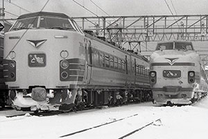 1981年は昭和56年。この冬の豪雪は「56豪雪」と呼ばれ、鉄道ダイヤは乱れに乱れた。1月14日付「新潟日報」朝刊1面トップの見出しは「上信越線 完全ストップ」。写真は、新潟市の車両基地で待機する特急「とき」。新旧の両タイプが併用されていたことが分かる。